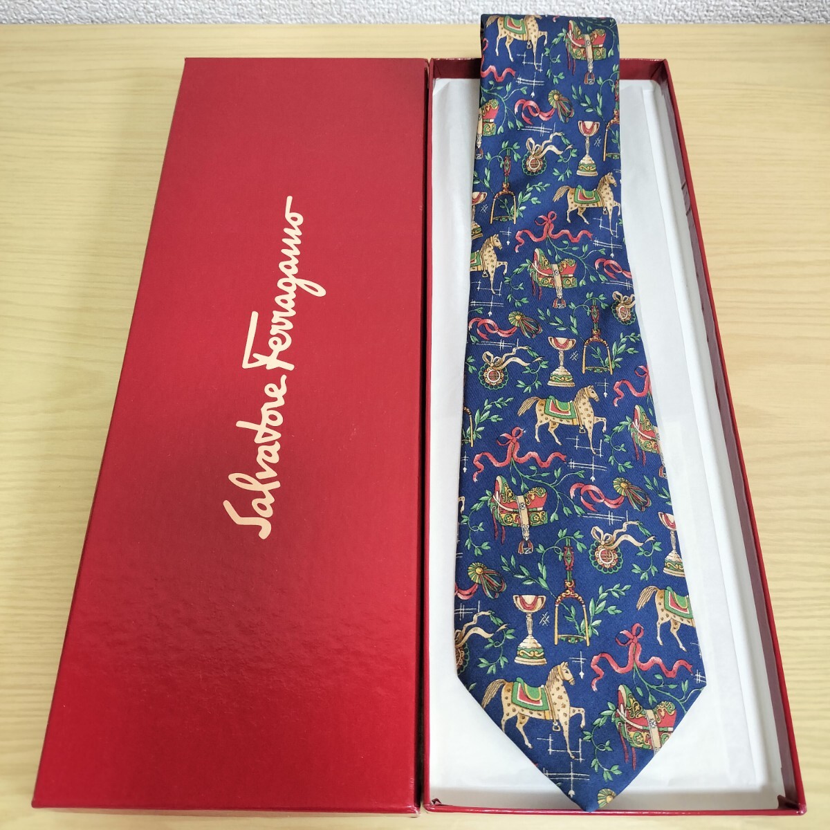 - Salvatore Ferragamo(サルヴァトーレフェラガモ)紺馬葉っぱトロフィー模様ネクタイ