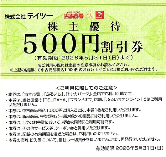 - テイツー 株主優待券 500円割引券 40枚set(20000円分)~7組迄 2026年5月末迄有効 古本市場 ふるいち トレカパーク