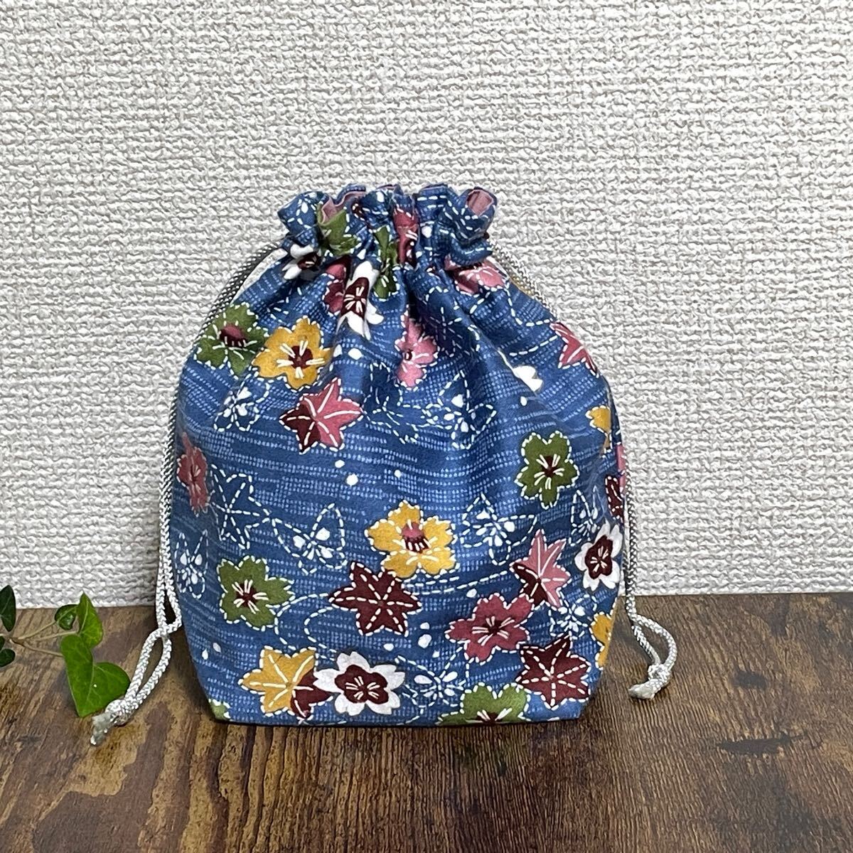 > ハンドメイド*シンプル巾着袋 * 和柄が可愛い巾着袋花と蝶 *和調*小物入れ♪ 【17×19×9】