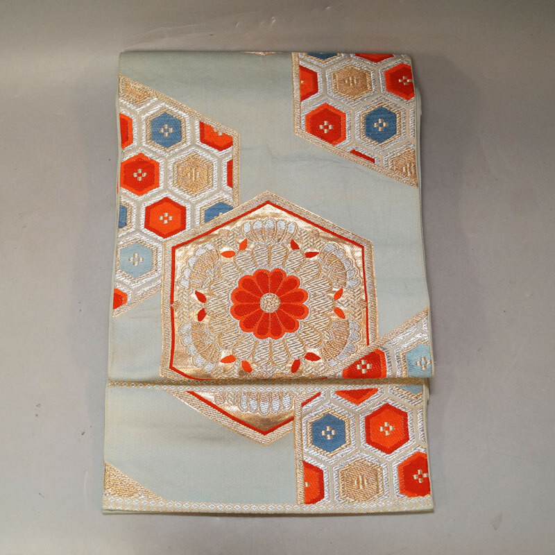 > ye26 本袋帯 六通柄 正絹 六角 花模様 水色 金糸 着物 最高級 仕上がり品 着物帯 和服 和装