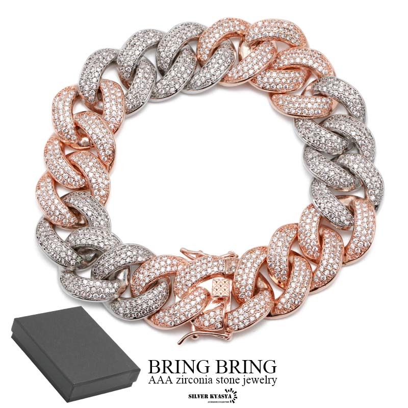 > (7inch(約18cm)) 喜平チェーンブレスレット CZ パヴェ 爪留め ブレスレット ピンクゴールド シルバー BOX付属