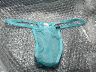 - TMコレクション、メンズビキニ、水色メッシュ地、フロント部ノーシーム、Tバック、ナイロン66%、M(ウエスト76~84)サイズ、