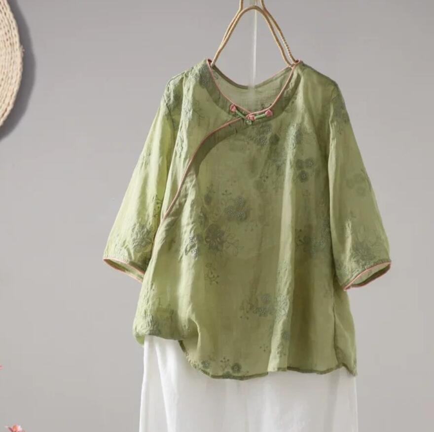 > 新入荷~チュニック 刺繍 シャツブラウス レディース シャツ ブラウス トップス 大きいサイズ ゆったり お花刺繍り~グリーン