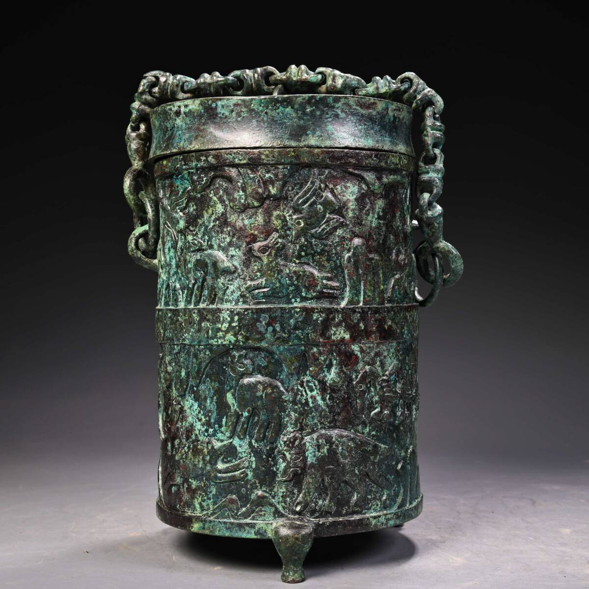 - TM8#6966【3.1】中国骨董 人間国宝 [ 珍品旧蔵青銅器狩猟鎖子提梁円倉缶] 銅器 金属工芸品 古玩收藏 復古 置物 純銅鋳造 開運風水