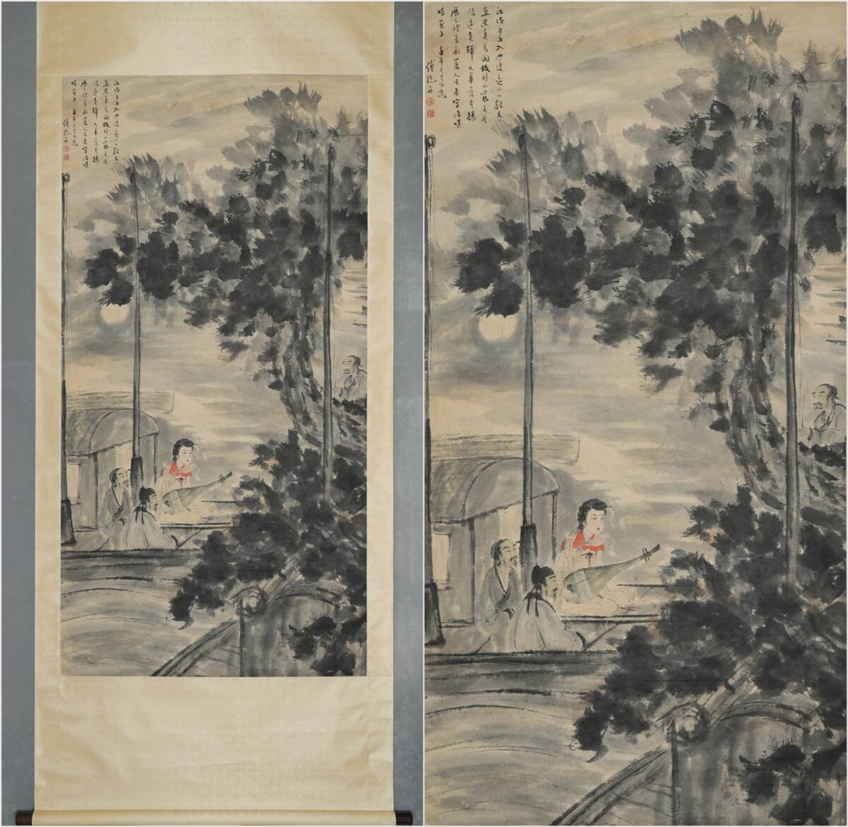 - 古美術 掛け軸 中国・近現代 「傅抱石書」 紙本 【江上琵琶図】 立軸 書道 巻き物 肉筆保証 唐物 古画 画心175x90cm LT-250826