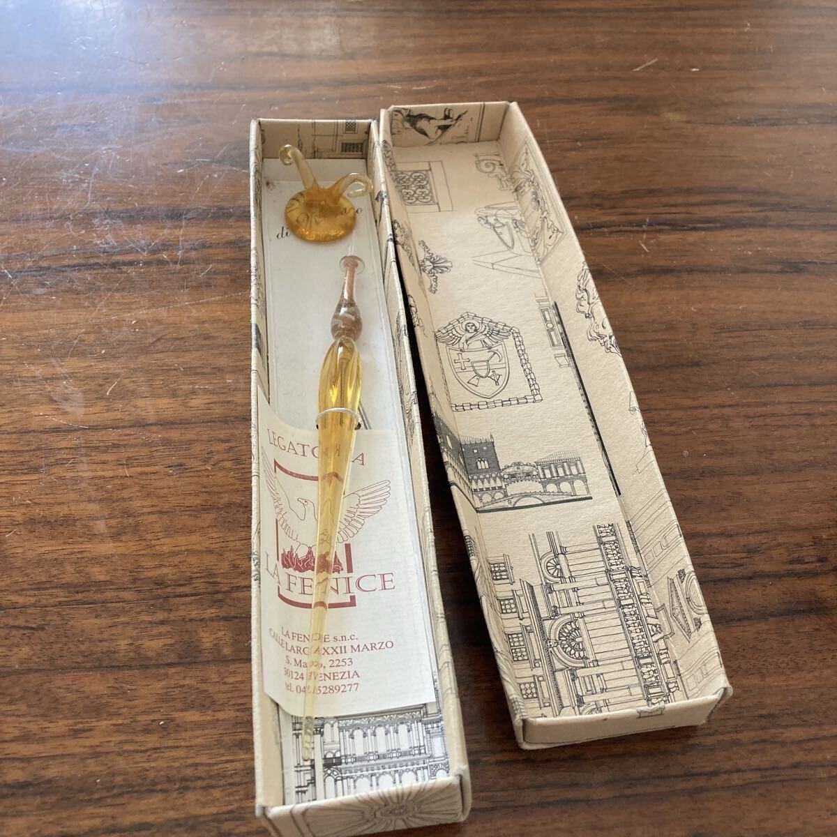 > ベネチアングラス万年筆 LEGATORIALA FENICE 黄色 アンティーク 台座付き インテリア 文房具 イタリア 工芸品 ガラス