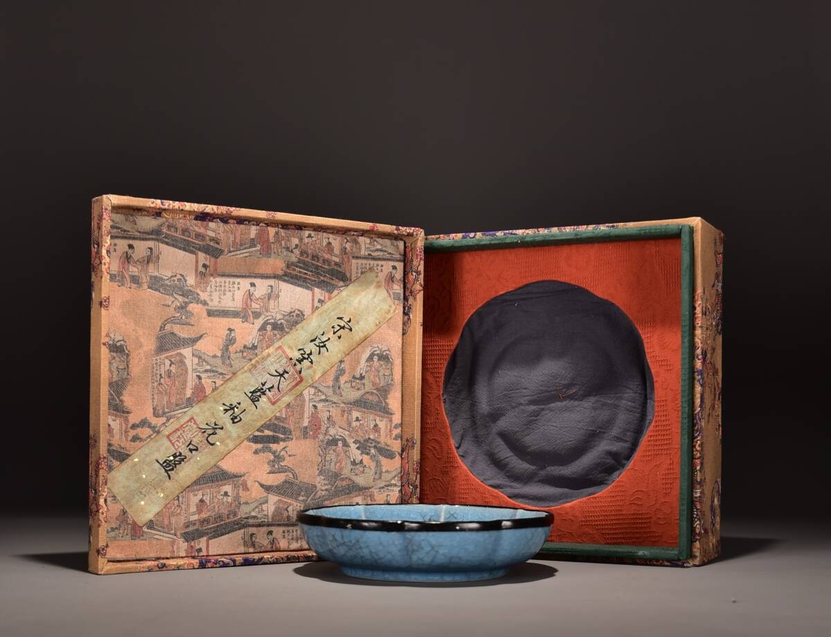 - 宋時代 古陶磁器 汝窯 天藍釉 花口盤 盤子 箱付 稀少珍品 文案置物 擺件 時代物 古董品 骨董 旧家蔵出し 唐物 中国古玩 古美術