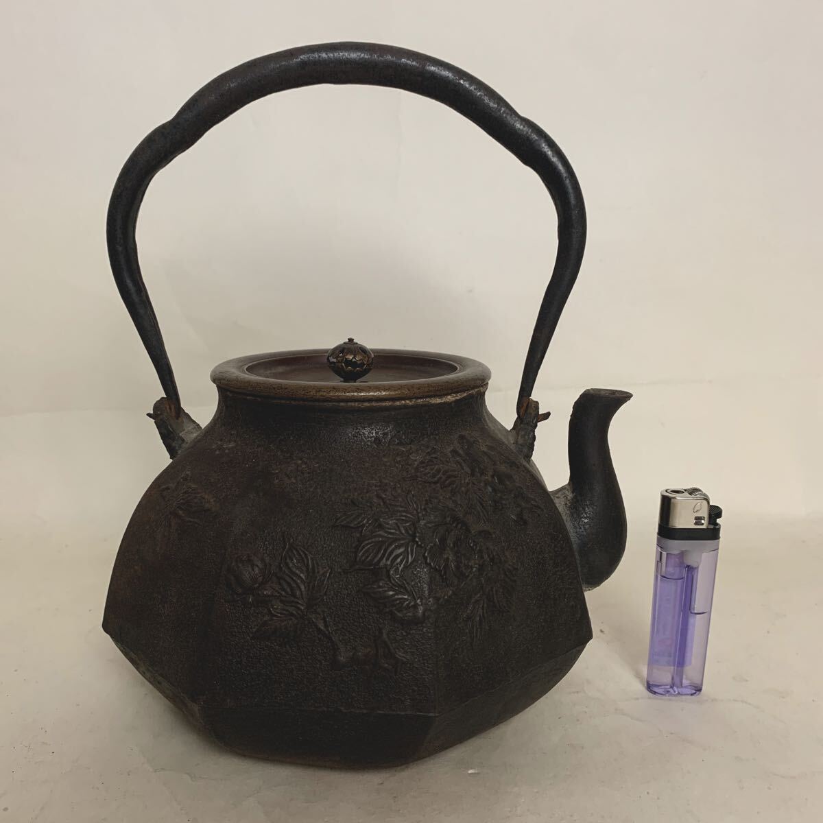 - 鉄瓶 龍文堂造 釜師 西房造 八角形 牡丹 蝶 紅葉