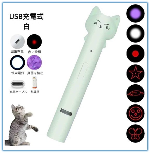 - グリーン 光おもちゃ 猫用 LEDライト ペンライト 猫型 猫ちゃん 猫グッズ 猫玩具 充電式 人気 猫 おもちゃ 7 in1機能 猫運動不足解消