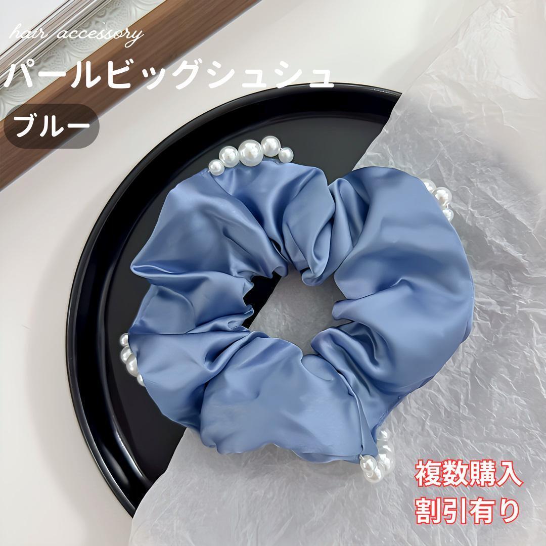 - ヘアアクセ 大きめ シュシュ ブルー ヘアゴム パール リボン 髪留め 髪飾り おしゃれ