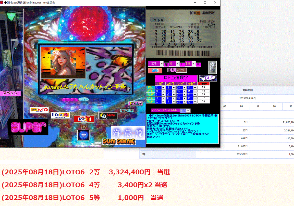 新作●ロトSuper海伝説SunShine2025●ソフト 只今 高額当選中ご案内いたします。(2025年08月18日)LOTO6 2等 3,324,400円 当選 (sunsetみうちゃんカットイン予告 *☆*ハイビスカスFLASH!!)(2025年08月18日)LOTO6 4等 3,400円x2 当選 (sunsetみうちゃんカットイン予告 *☆*ハイビスカスFLASH!!)(2025年08月18日)LOTO6 5等 1,000円 当選 (sunsetみうちゃんカットイン予告 *☆*ハイビスカスFLASH!!)(2025年08月14日)LOTO6 2等 31,221,400円 当選 (sunsetみうちゃんカットイン予告 *☆*ハイビスカスFLASH!!)(2025年08月14日)LOTO6 4等 9,200円x2 当選 (sunsetみうちゃんカットイン予告 *☆*ハイビスカスFLASH!!)(2025年08月14日)LOTO6 5等 1,000円 当選 (sunsetみうちゃんカットイン予告 *☆*ハイビスカスFLASH!!) ロト予想ソフト業界では珍しい ハイタッチ画面告知を搭載! 液晶の裏番組モニターにサンセットビーチが映れば、激熱です! 魚群は「アニメ魚群予告」になれば、高額当選スーパーリーチ~!!! 新告知「sunsetみうちゃんカットイン予告」 にサンセットビーチが映れば、激熱です!(2025年08月18日)LOTO6 2等 3,324,400円 当選 (sunsetみうちゃんカットイン予告 *☆*ハイビスカスFLASH!!)(2025年08月18日)LOTO6 4等 3,400円x2 当選 (sunsetみうちゃんカットイン予告 *☆*ハイビスカスFLASH!!)(2025年08月18日)LOTO6 5等 1,000円 当選 (sunsetみうちゃんカットイン予告 *☆*ハイビスカスFLASH!!) ●ロトSuper海伝説SunShine2025 LOTO6 予想結果 ●(2025年08月14日)LOTO6 2等 31,221,400円 当選 (sunsetみうちゃんカットイン予告 *☆*ハイビスカスFLASH!!)(2025年08月14日)LOTO6 4等 9,200円x2 当選 (sunsetみうちゃんカットイン予告 *☆*ハイビスカスFLASH!!)(2025年08月14日)LOTO6 5等 1,000円 当選 (sunsetみうちゃんカットイン予告 *☆*ハイビスカスFLASH!!) ●ロトSuper海伝説SunShine2025 LOTO6 予想結果 ●■ハイタッチ*☆*ハイビスカスFLASH!!*☆*ハイビスカスFLASH!! ★ハイタッチ画面告知でまた当選! 高額当選中です! ハイタッチ画面が、もし出ましたら、すぐにマウスカーソルを小窓に当ててください♪ 只今ロト6 ハイタッチでは1等の2億7千万円高額当選しています! 引きの強いソフトユーザー様なら、強運の1等引き当て1億~8億当選も、夢では有りません♪ 今回2等でも3千万ですからね、2等も取りこぼせません。 ロト7にも対応(※現在稼動中のロト7ソフトでは、最強クラスです♪) ブルーLEDボタン信頼度告知機能を搭載!(任意でボタンを押させる新機能) 豊富なリーチアクション(ジンベイザメSuperリーチ、青魚群Superリーチ、クラゲ、その他多数) 新告知「sunsetみうちゃんカットイン予告」 にサンセットビーチが映れば、激熱です!このソフトは、当てやすい ロト予想 本線主体の甘デジタイプです。スタッフも驚きを隠せません! もちろんここは、大勝負です!見てください! これが新作の実力です! 今日から熱いですね! 対応OS Windows版 11 10 7 8 8.1 XP Vista Me 95 98 2000全対応初心者にも簡単に使用可能な、全マウス操作方式。一部手入力。このソフトの優秀な予想は、固定係数+過去の当選数字を元に算出されています。 是非、このサービス価格のうちに手にして、高額当選に向けてご活用下さいませ。●ロトSuper海伝説SunShine2025● ソフト価格 399800円⇒価格5000円