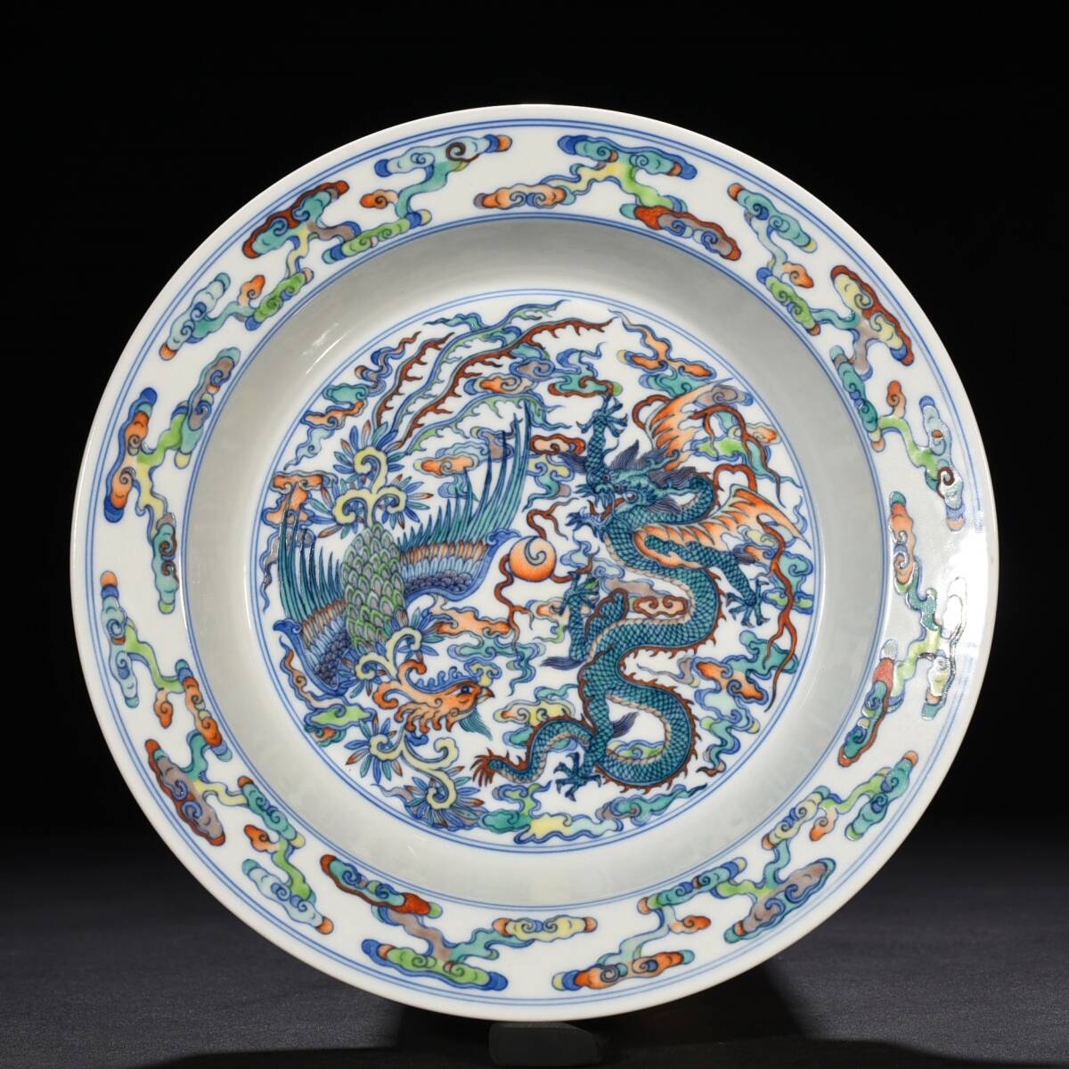 - 珍しい 唐物 中国 清時代 雍正年製 闘彩龍鳳紋 折縁盤 古染付 中国美術 骨董 古美術 819