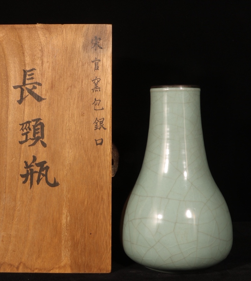 - 宋時代 官窯 包銀口 長頸瓶 共箱付き 高さ23 cm 直径14 cm 中国骨董 珍品旧蔵 古賞物 時代物 819