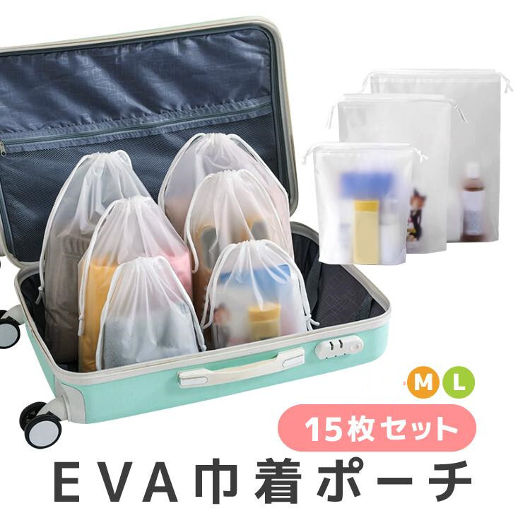 - ビニール巾着袋 収納袋 収納ポーチ EVAポーチ 半透明 防水防湿 マチ付き 着替え服/化粧品/靴袋/水泳/海水浴 15枚セット LP-VKB15S