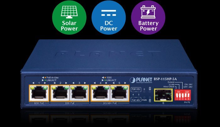 - 再生可能エネルギー 5ポート ハイブリッド PoE ソーラー PoE スイッチ