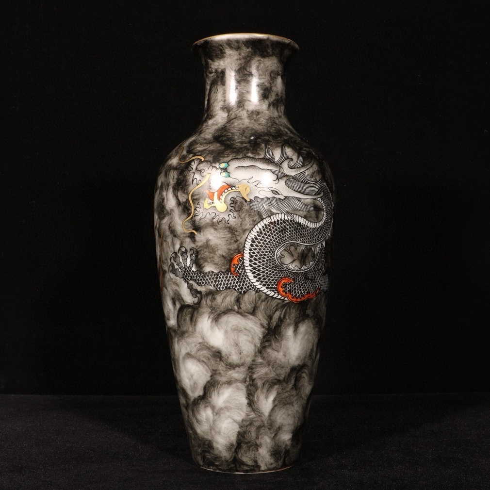 - 中国清代 乾隆年製 石紋釉 墨彩蒔絵金 龍紋賞瓶 時代物 陶磁器 中国美術 高さ25 cm 直径9 cm 骨董品 唐物 820