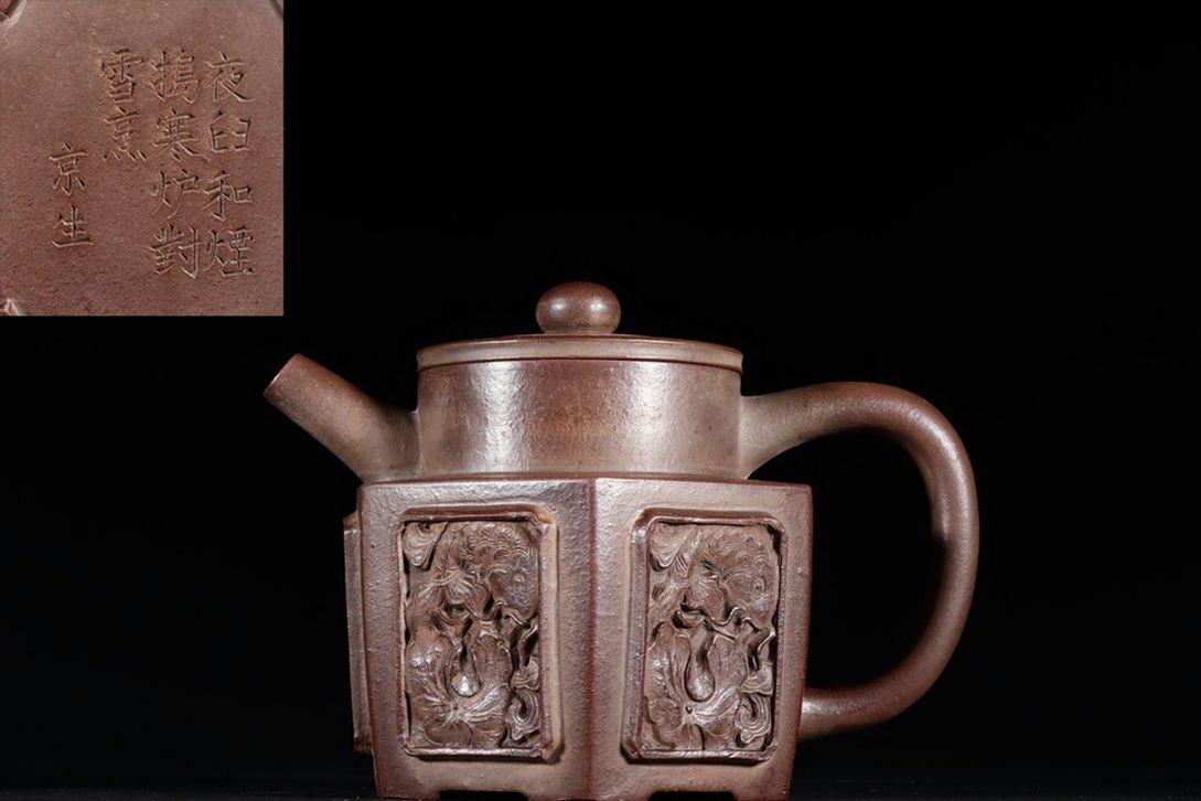 > ◆羽彰・古美術◆Y0788時代朱泥 六方開光印花紋執壺 紫砂壺 在銘 京生 清代 在銘 /紫砂 煎茶道具 朱泥 茶壺