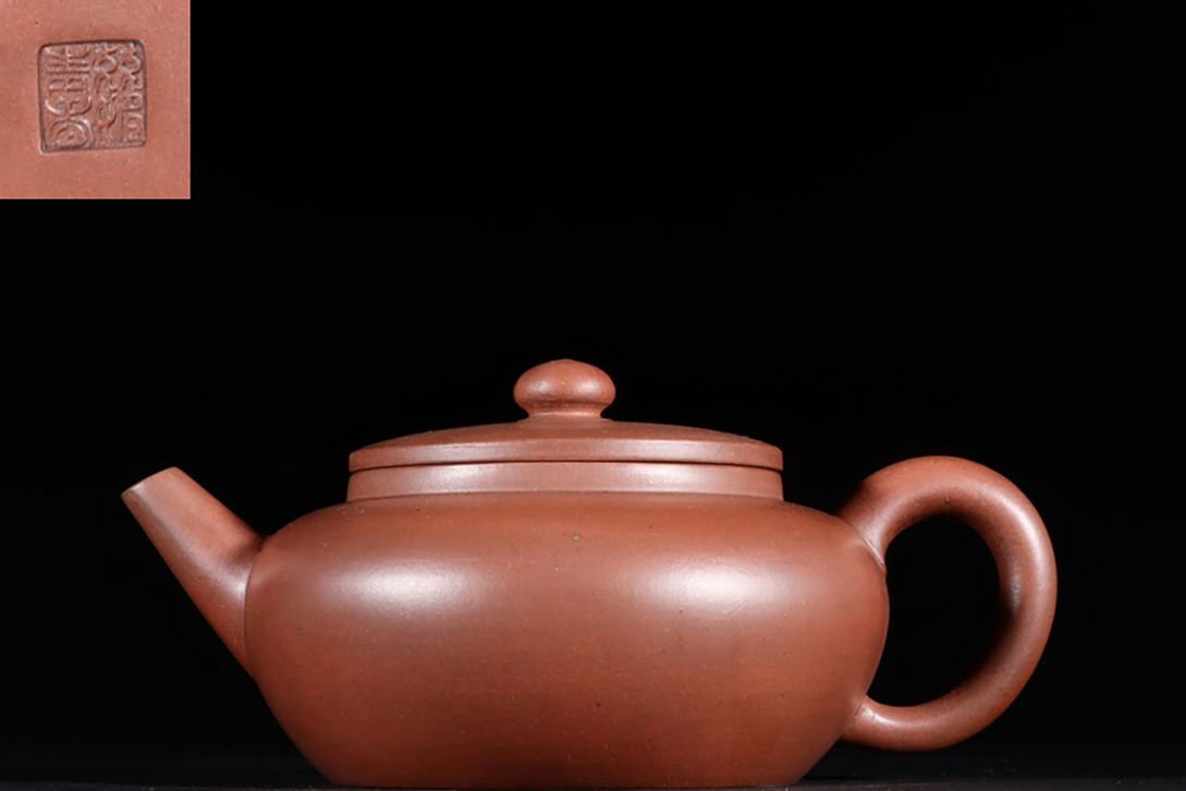> ◆羽彰・古美術◆Y0785時代朱泥 扁胴紫砂壺 在銘 兢媚青香 清代 在銘 /紫砂 煎茶道具 朱泥 茶壺