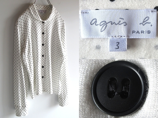 > agnes b. アニエスベー ドット柄 レーヨンジャージー ラウンドカラーシャツ 丸襟 ブラウス 3 ホワイト ブラック 白黒 チュニジア製