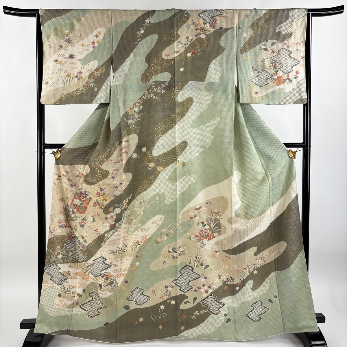 - 訪問着 身丈164cm 裄丈65cm M 袷 草花 破れ色紙 金彩 灰緑 正絹 秀品 【中古】