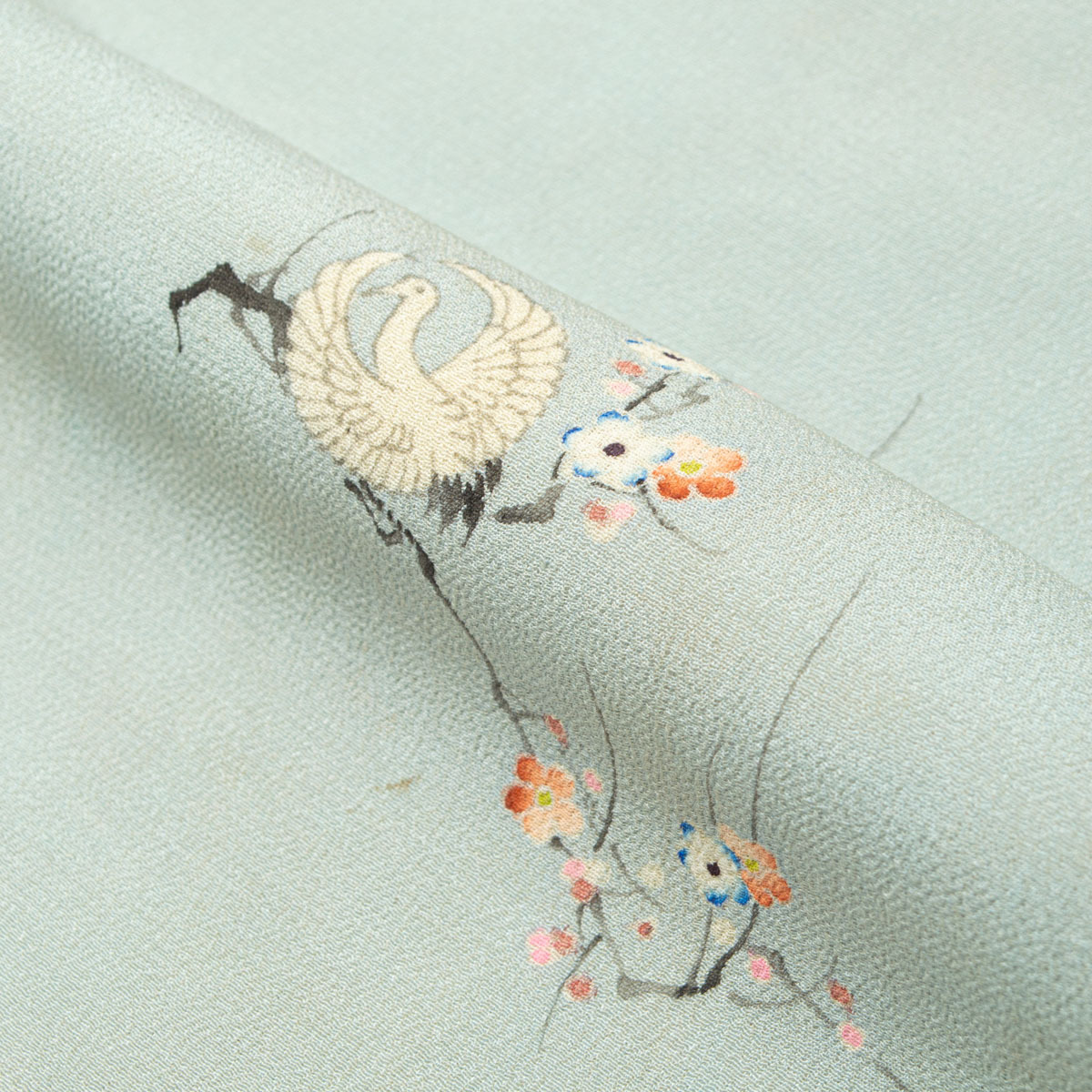 - 【江戸ちりめん】アンティーク 昼夜帯 梅の木と鶴丸文 白藍 正絹 ヴィンテージ品