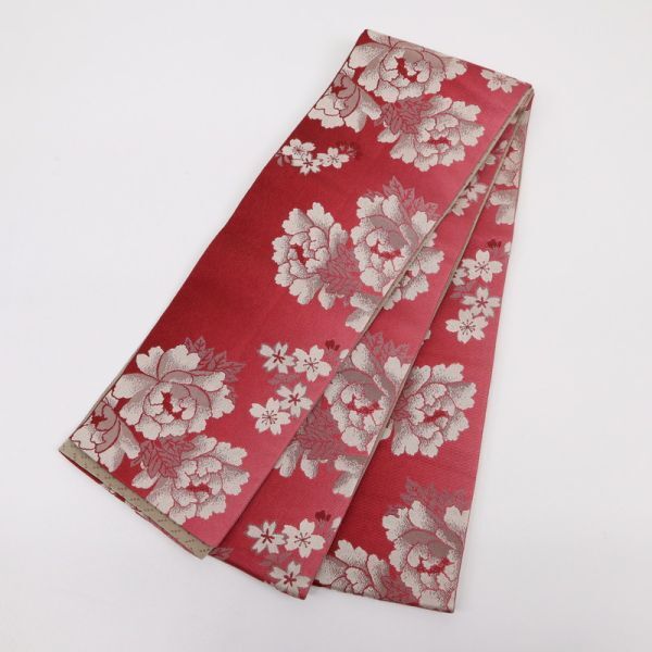 - 【半幅帯】 牡丹柄 赤グラデーション 牡丹や桜 赤 化繊 夏着物 浴衣に♪ BR7-10