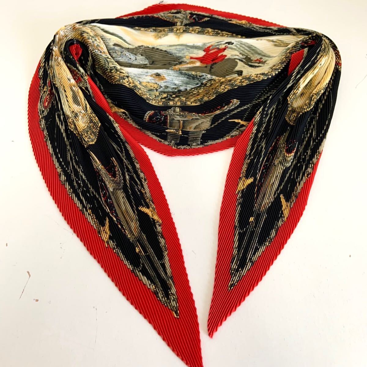 - イタリア製 100% POLYESTER ひし形プリーツ スカーフ 馬柄 総柄 レッド系 レディース ストール プリーツスカーフ
