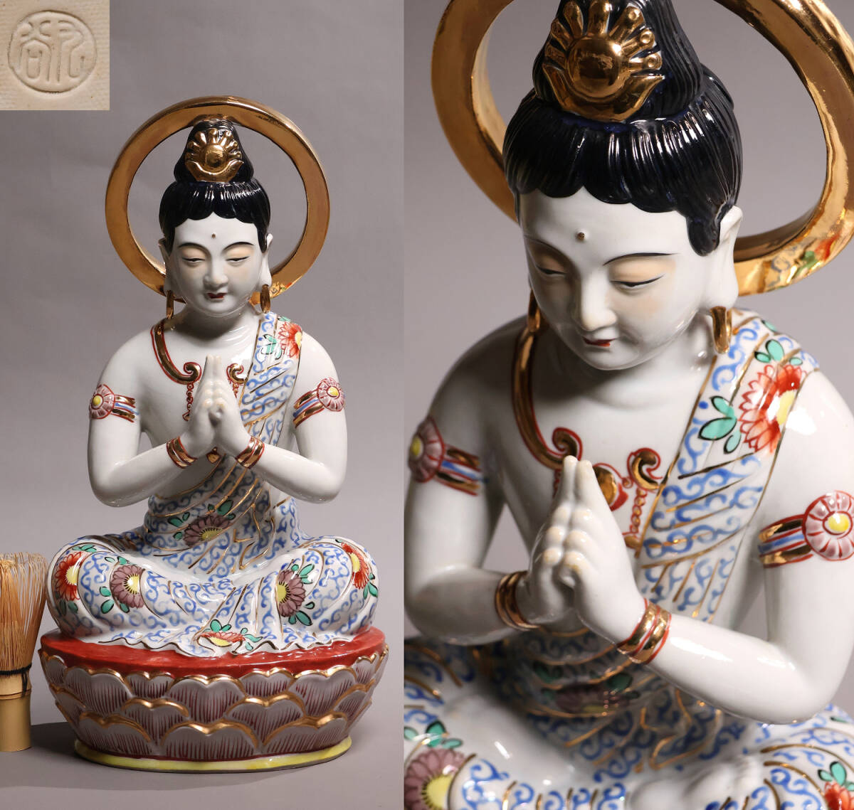 - 九谷焼 観音菩薩坐像 高36.5cm 金彩 色絵 置物 仏像 陶磁器 陶芸【MA816】