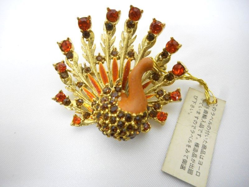 - ブローチ クジャク 孔雀 ラインストーン オレンジ×ゴールド M-031