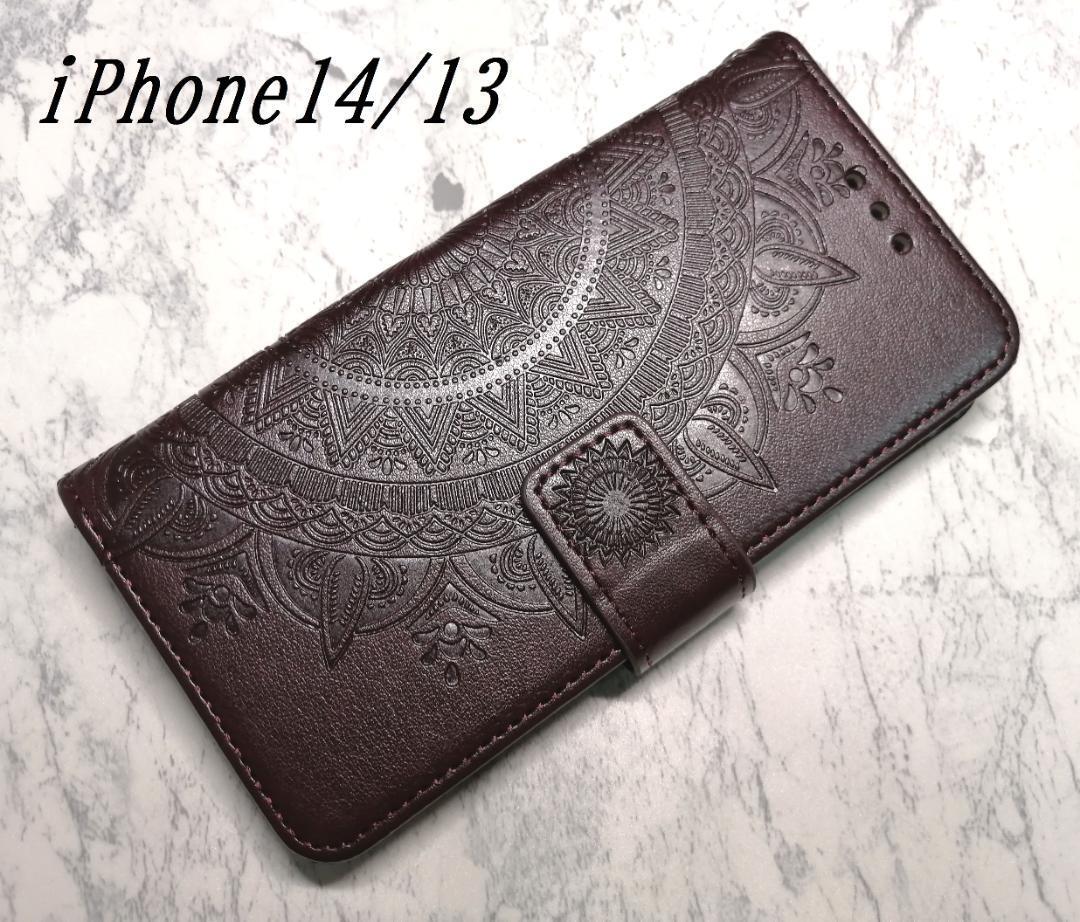 > 手帳型 iPhone14/13 用 ケース マンダラ ブラウン