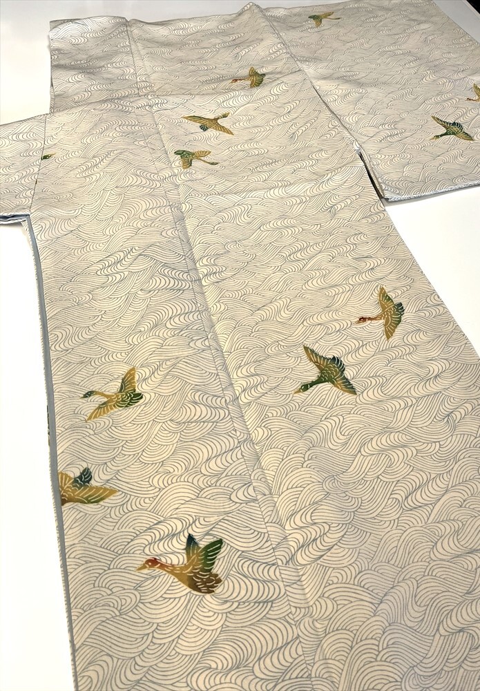 - 花とら●リサイクル着物 小紋 波に鴈 型染 着用可能 リメイク 素材 生成り 250816