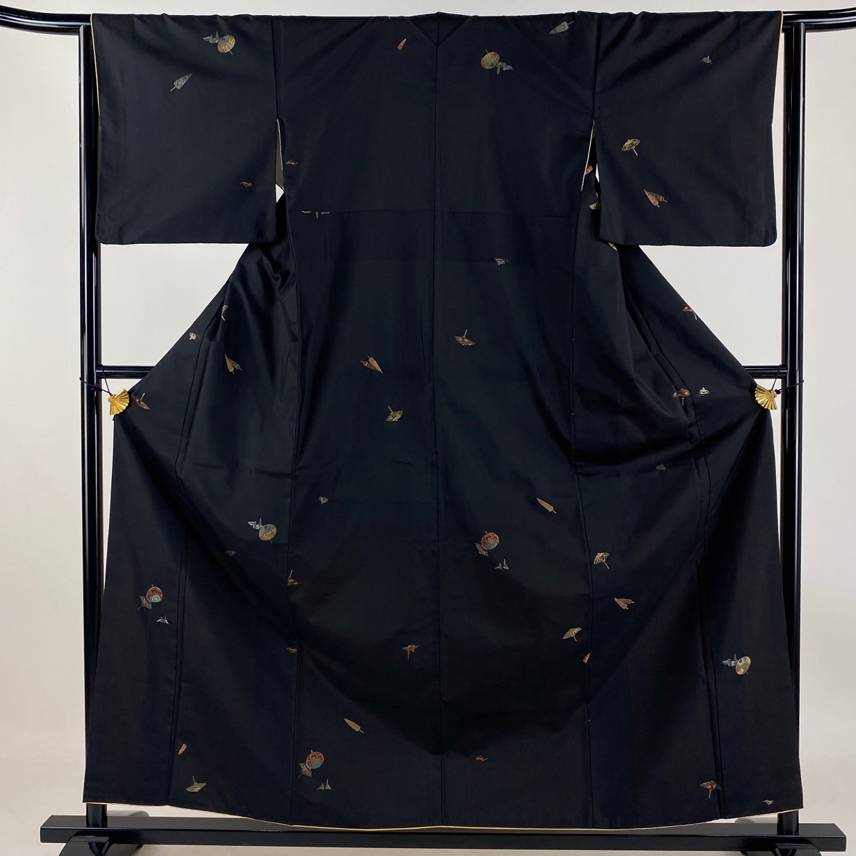 > 小紋 身丈158cm 裄丈63cm S 袷 紬地 番傘 折鶴 金糸 刺繍 黒 正絹 名品 【中古】