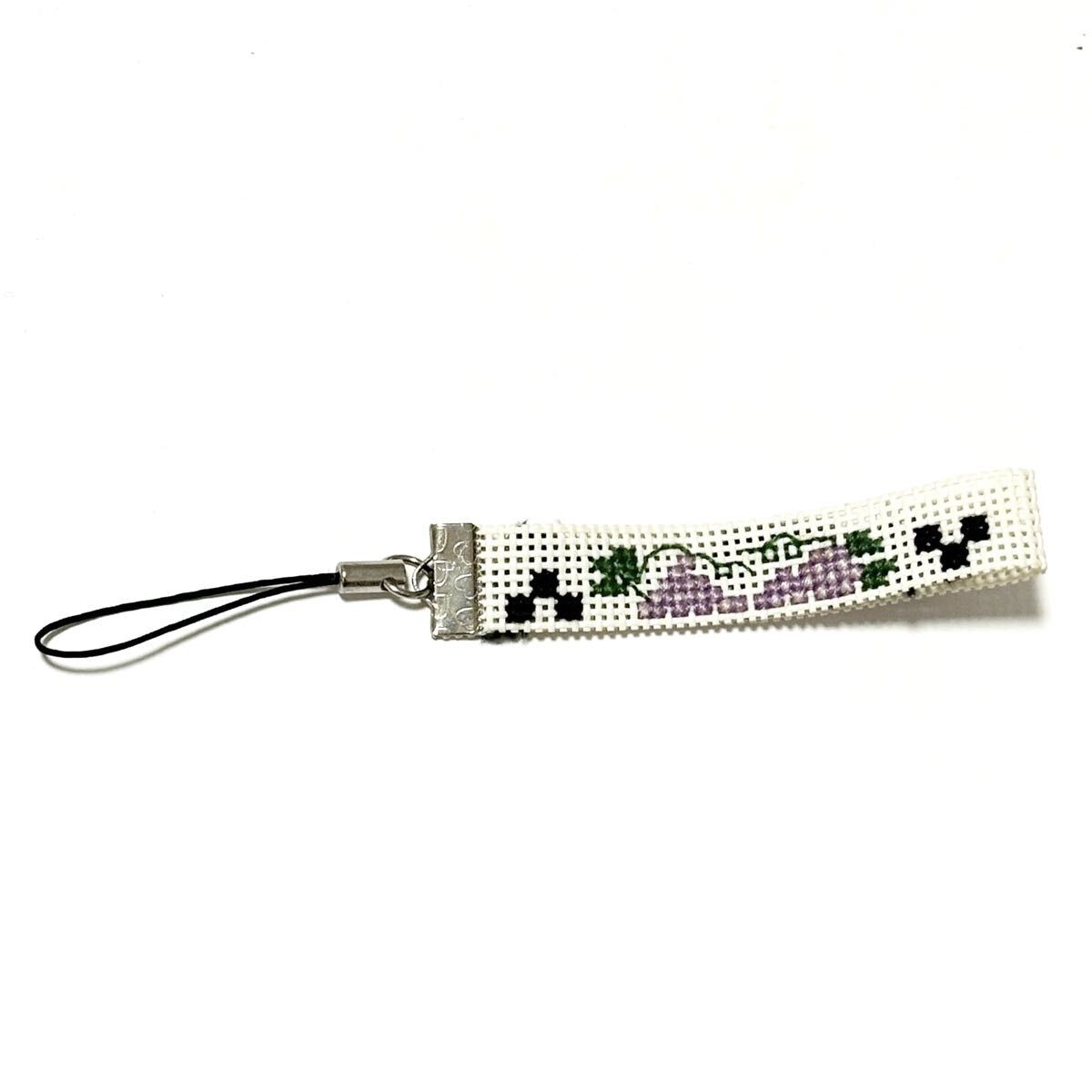 - 刺しゅう ストラップ ぶどう 音符 白 紫パープル系 根付け キーホルダー