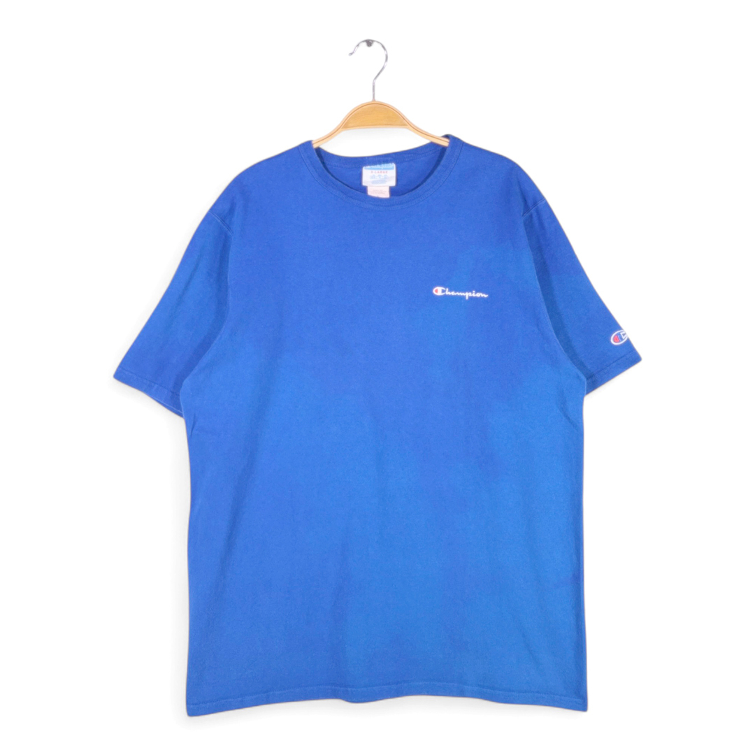 - 【送料無料】チャンピオン Tシャツ ワンポイントロゴ 刺繍ロゴ 半袖 CHAMPION 大きいサイズ ブルー 青色 メンズXL 古着 @BZ9066