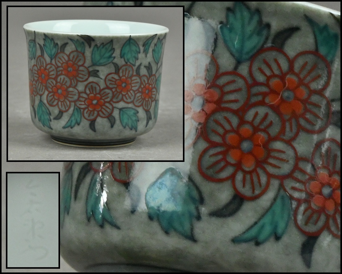 - 【ACT】人間国宝【今泉今右衛門】本人作 色絵吹墨 草花文 ぐい呑 酒器 美術品 A7-826-5