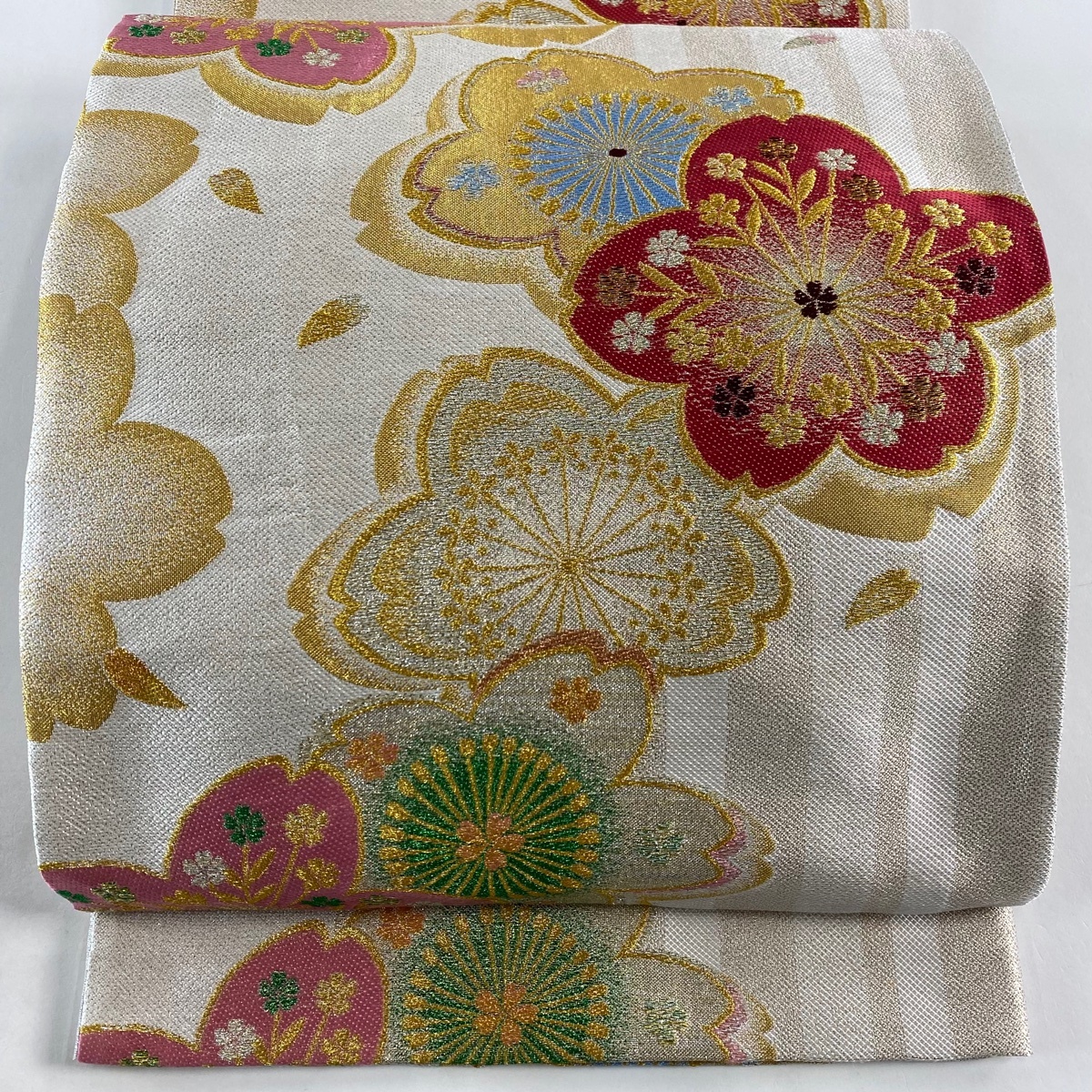 > 袋帯 美品 秀品 桜 縦縞 金糸 箔 クリーム 六通 正絹 【中古】