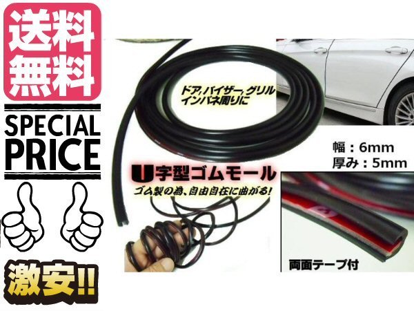 > 自由自在 柔軟性 両面テープ付 U字 ゴムモール 幅 6mm 10M グリル 黒色 ドレスアップ キズ防止 保護 送料無料/6