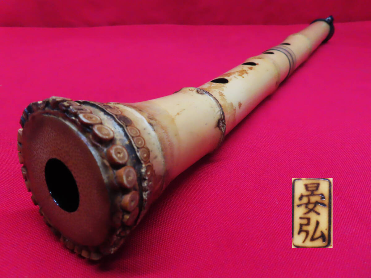 > 竹尺八 琴古流 在銘 晏弘 二印 銀三線籐巻き 五孔 中継ぎ 全長約51.5cm 重量約360g 和楽器 管楽器 管理7k0828L-J02