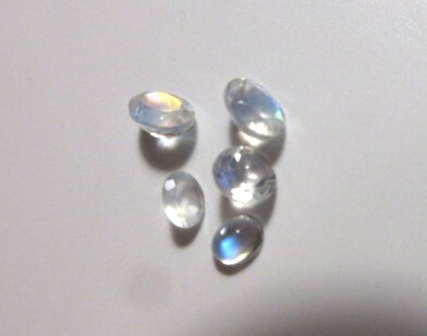 ブルーやオレンジのシラーが出ているレインボームーンストーンです。小粒で、インクルージョンがありますが、透明感とテリがあります。一番小さな1点はカボーションです。非加熱。