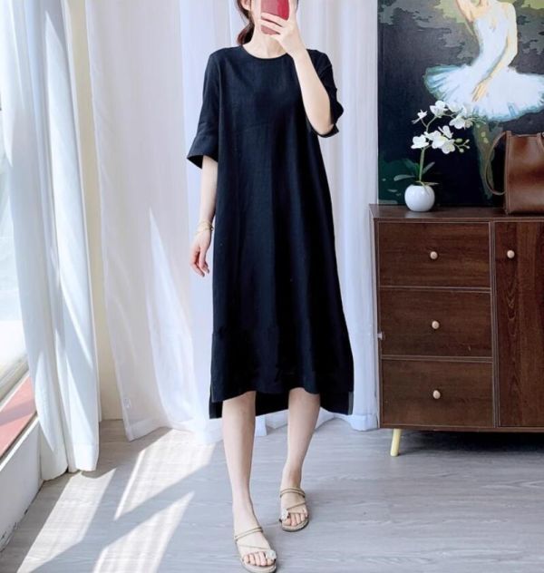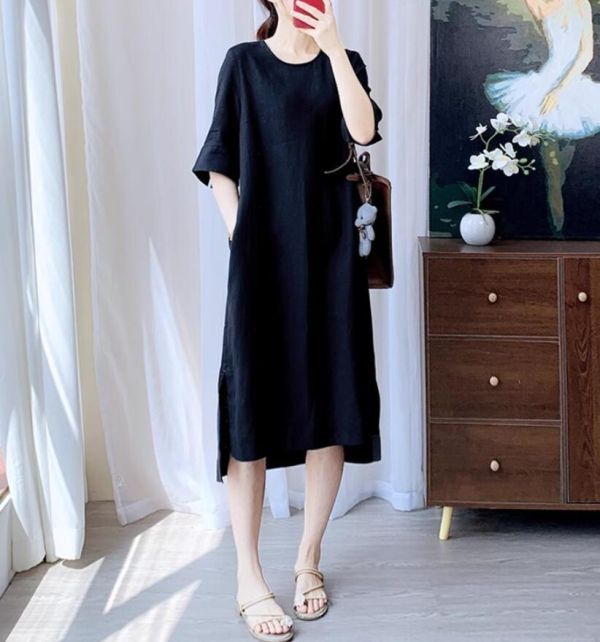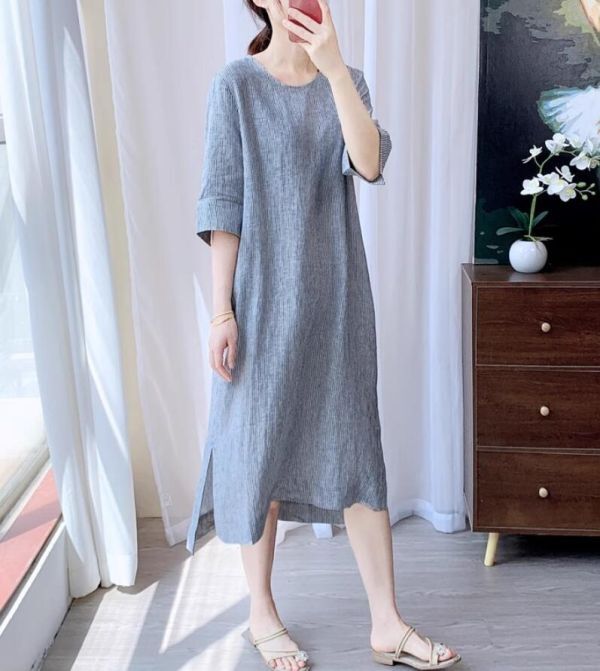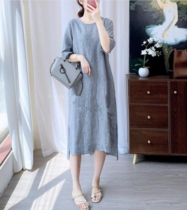 - 夏新品 * カジュアル ゆったり 半袖 ワンピース シンプル Aラインワンピース レディース きれいめ ミモレ丈 ロングワンピース * ブルー