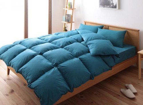- 数量限定 未使用訳あり スモールフェザー100% 羽根布団 ダブル 10点セット ピーチスキン仕様 ベッドタイプ ブルーグリーン