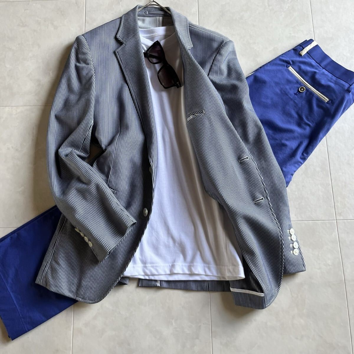 - 美品 Mサイズ P.S.FA ピーエスエフエー セットアップ ジャケット ストライプ パンツ 青 春夏 涼感 ブルー