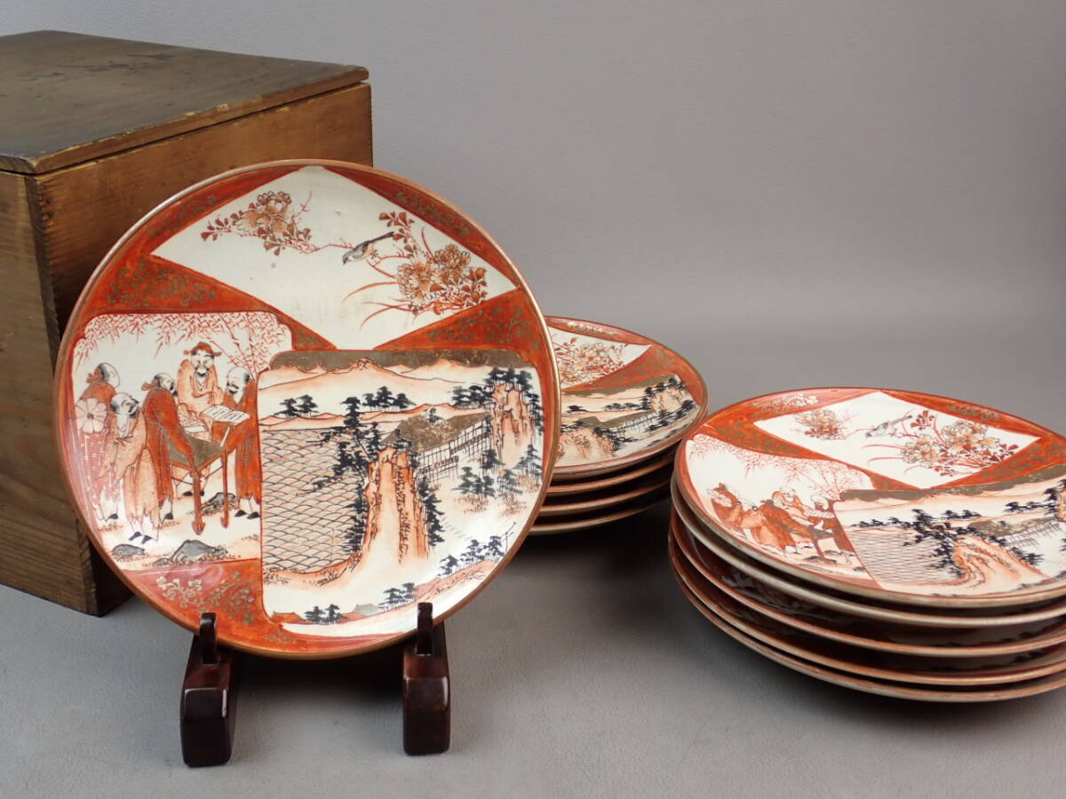> 【骨董・茶道具】★古い 九谷焼 古九谷★★赤絵山水花鳥人物文皿 10客 go086sl 和食器