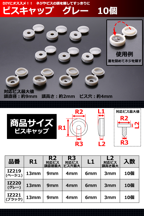 - ビスキャップ 10個 ネジやビスをカバー 内装などの見栄えをアップ グレー IZ220