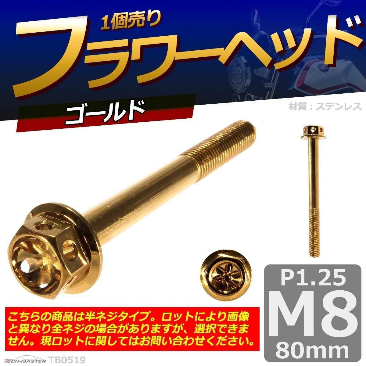 - M8×80mm P1.25 フラワーヘッド 六角ボルト ステンレス 車/バイク/自転車 ドレスアップ ゴールド 1個 TB0519