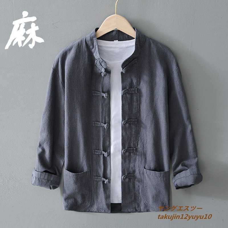 - 新品 メンズジャケット 春夏秋 リネン カーディガン 長袖シャツ 綿麻 スタンドカラー 上質 レトロ 立襟 カジュアル 五色選択 グレー M