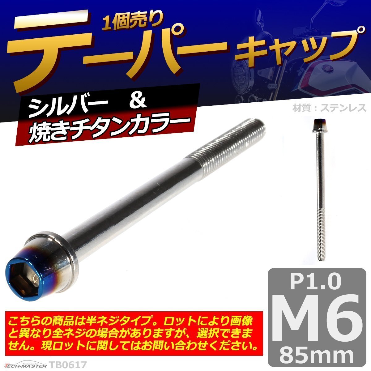 - M6×85mm P1.0 テーパー キャップボルト ステンレス 車/バイク/自転車 ドレスアップ パーツ シルバー&焼きチタンカラー 1個 TB0617