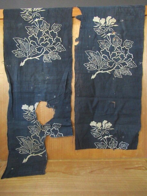 > ●木綿筒描き2枚●本藍染●牡丹●継ぎ接ぎあて布●ボロ●リメイク素材●ゆうパケット¥360-●