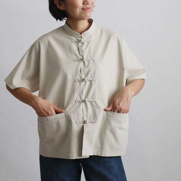 - 残暑SALE ベビーキャンバス 花ボタン スタンドカラー ジャケット カンフー 前開き アイボリー H45A