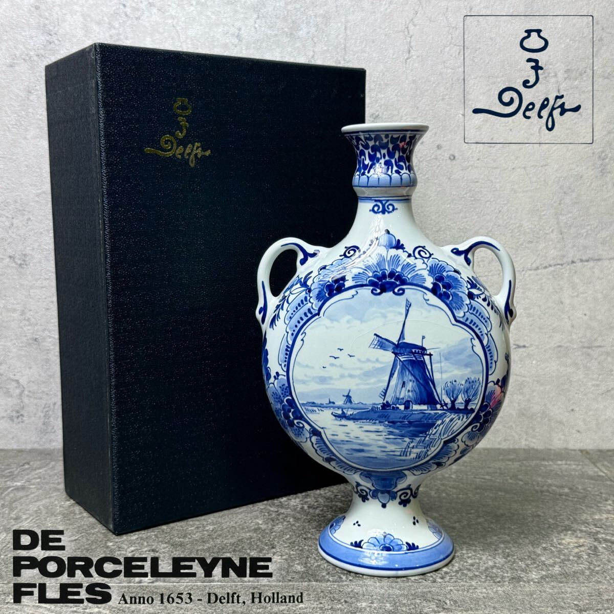> MJ250903-7【希少未使用】DE PORCELEYNE FLES ポルスレンヌ・フレス社 ロイヤル デルフト 花器 花瓶 手書き 染付 オランダ 風車図 箱付